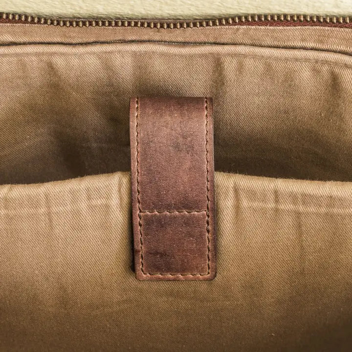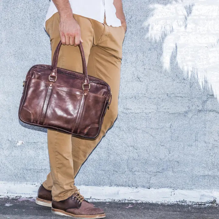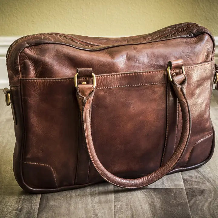 Genuine washed leather. Removable and adjustable shoulder strap. External sleeve pocket on both sides, Internal zipper pocket + 13" laptop sleeve.