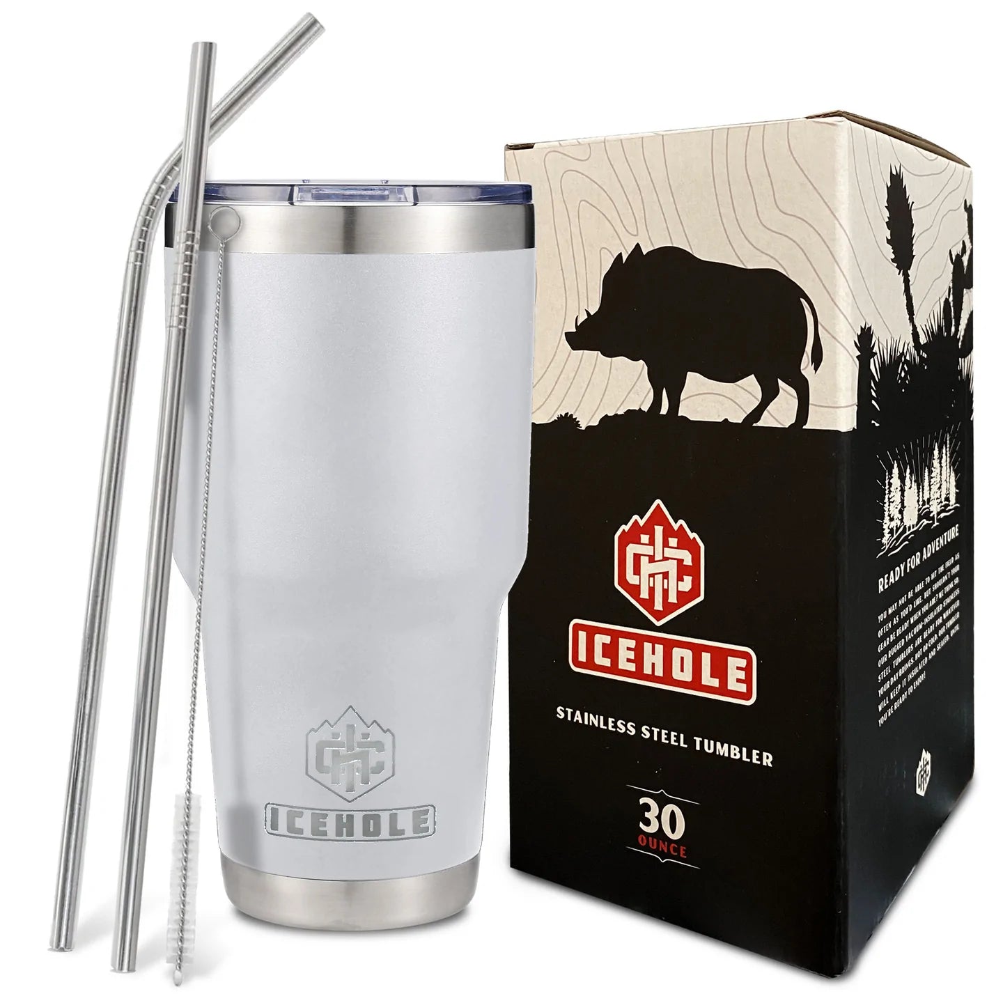 The ICEHOLE Package. Premium stainless steel tumbler is everything you could ask for when taking your favorite beverage on the go with 2 metal straws (1 Curved + 1 Wider Straight) and a cleaning brush. All of this is packaged in a gift box that is easy to share with any ICEHOLE fan.