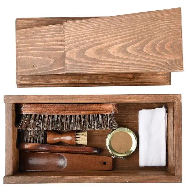 Boot Cleaning Kit.This boot cleaning set in wooden box consists of a applicator brush, a polishing brush, a dauber, a shoe horn, black shoe polish and a cleaning cloth. The kit has everything to keep shoes in top condition.