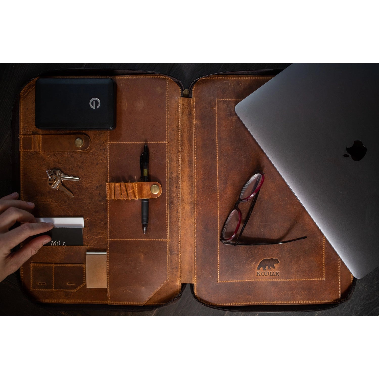 1- Phone sleeve 1- 14" document or laptop sleeve (fits a 13” Macbook) 2- Leather cord holders 5- Pen slots 1- Power bank sleeve Measures 15" x 11" x 1.5” Please note: As it is made of a natural material, each portfolio varies slightly in texture and color.