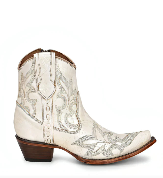 You will love this romantic Western-style ankle boot. Genuine handcrafted leather upper. Side zip closure for easy on and off. Soft leather lining for a comfortable fit. Lightly cushioned leather footbed for all-day comfort. Round toe. Stacked leather heel. Durable leather outsole with a rubber heel cap for added traction.