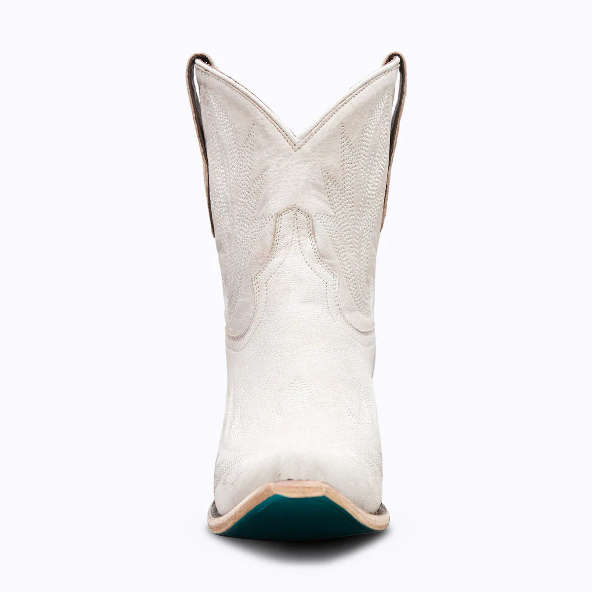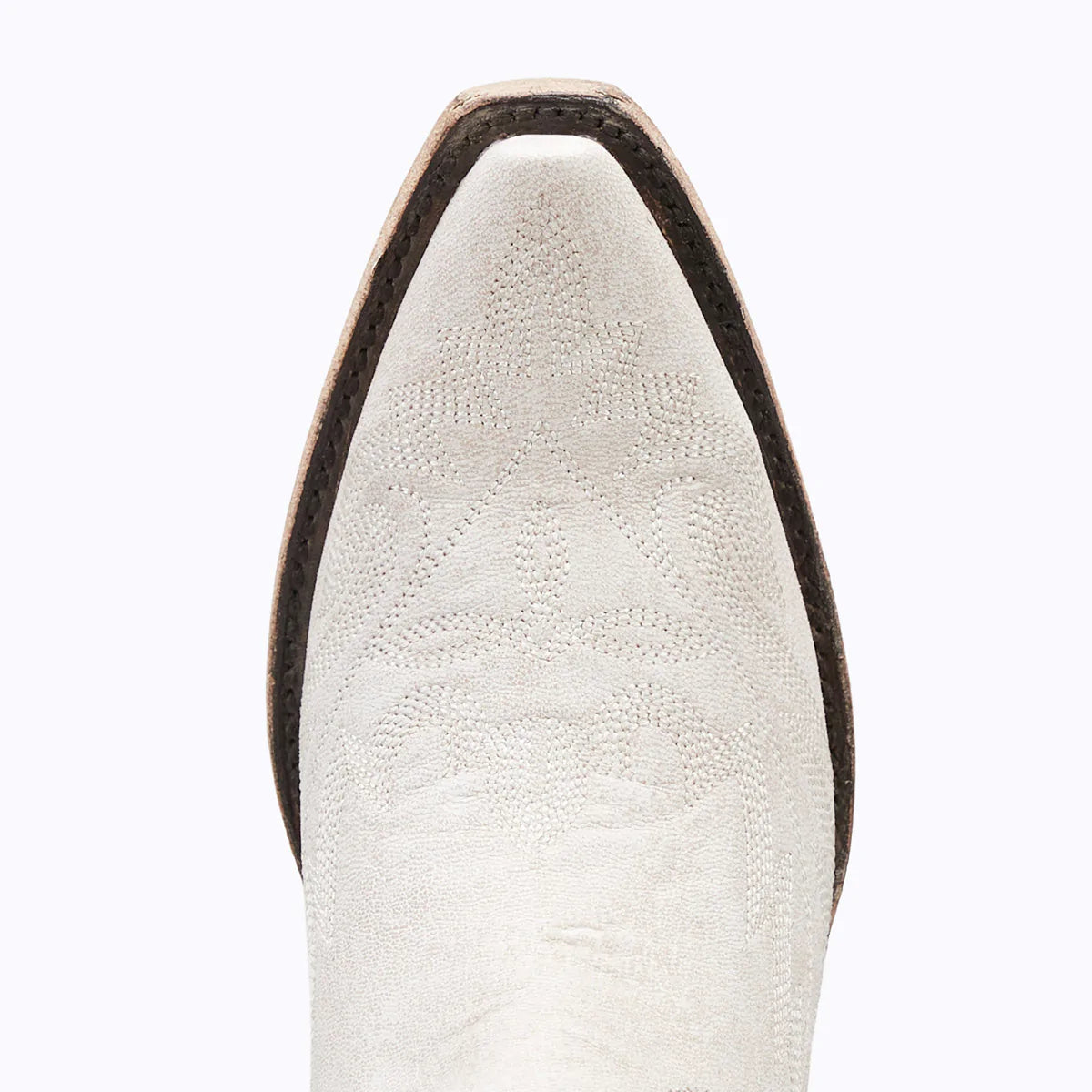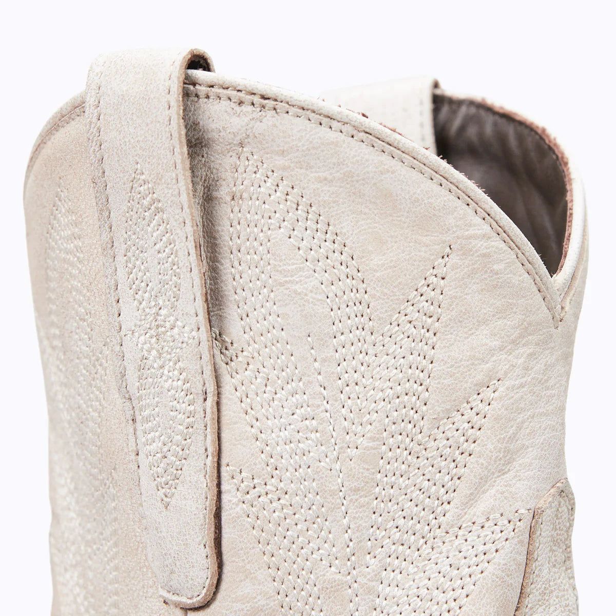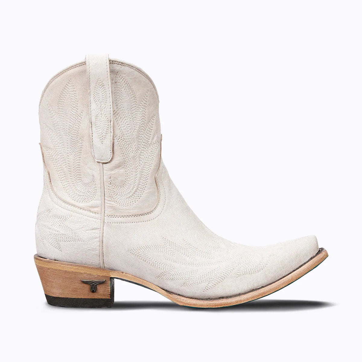 We just found the cutest, sweetest, most adorable pair of off white cowgirl booties! Meet the Lexington in Ceramic Crackle! Designed by Lane Boots, we are loving the darling ankle height silhouette! She features the most stunning shade of neutral leather and classic western stitch patterns. We love this style year around with jeans or dresses for a fun and cute country look!
