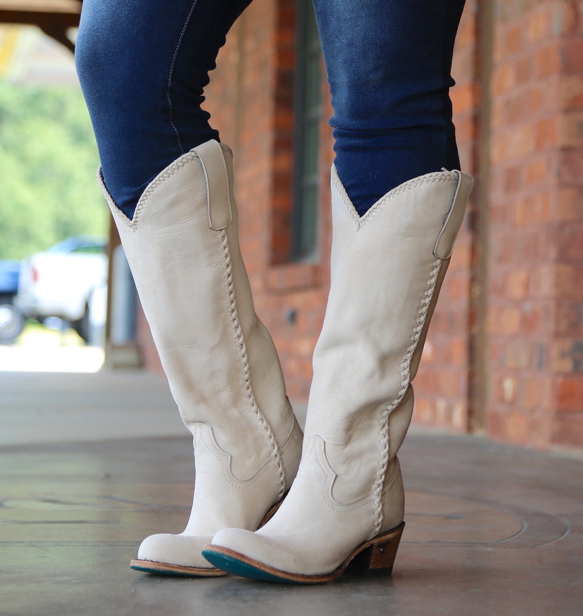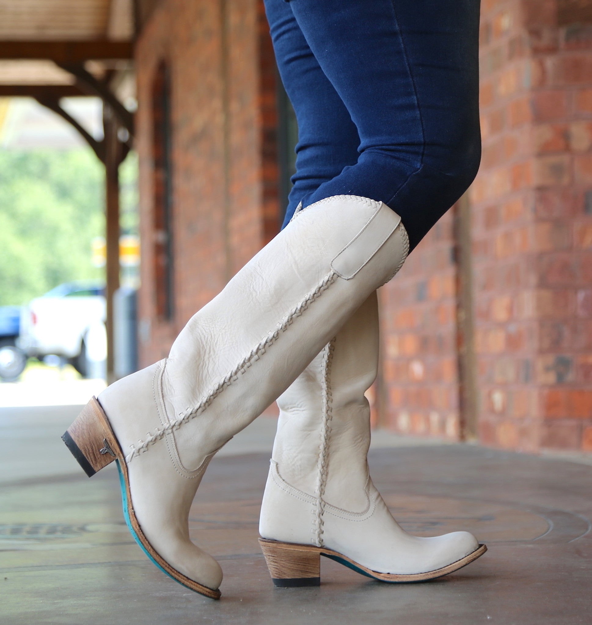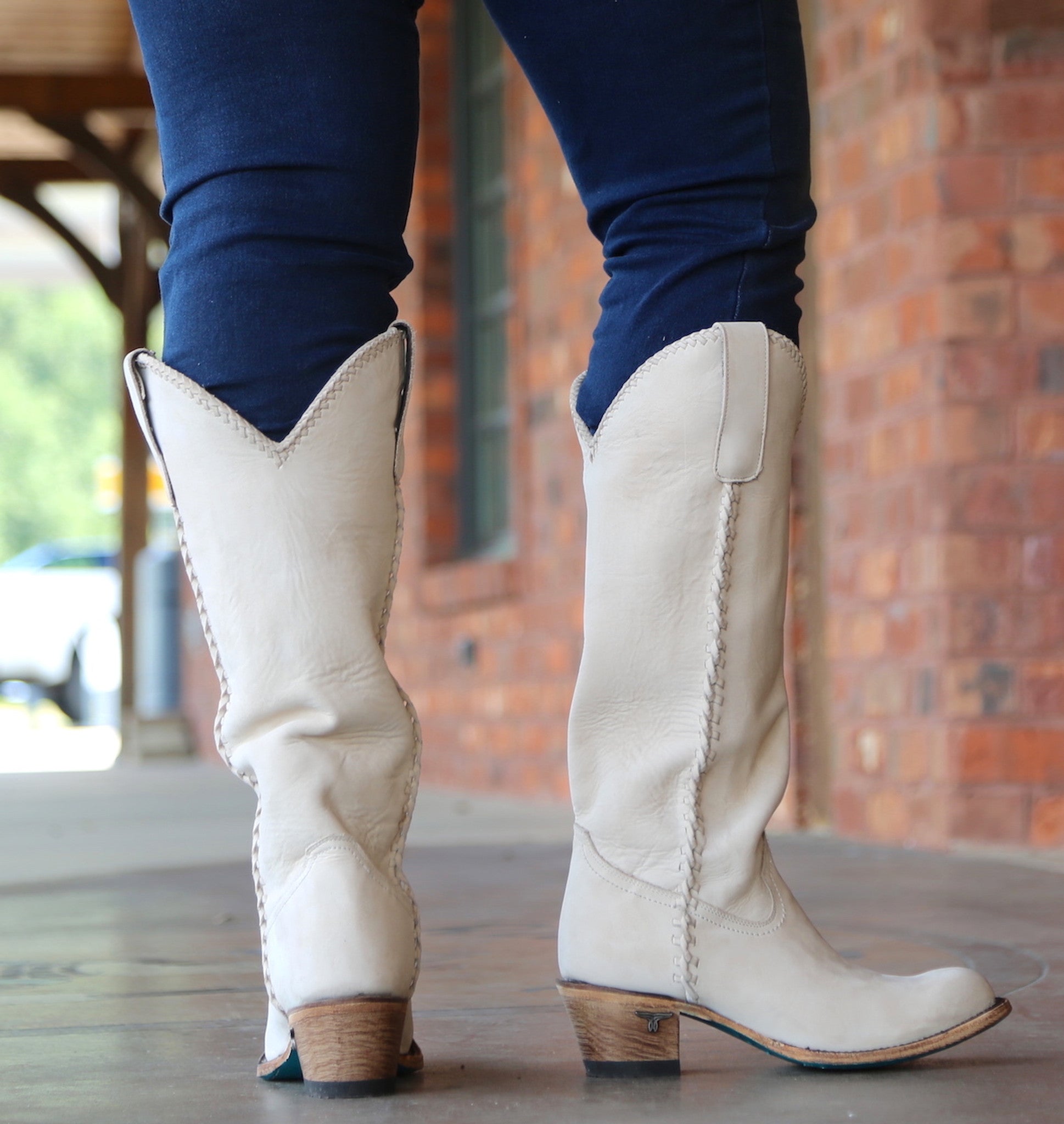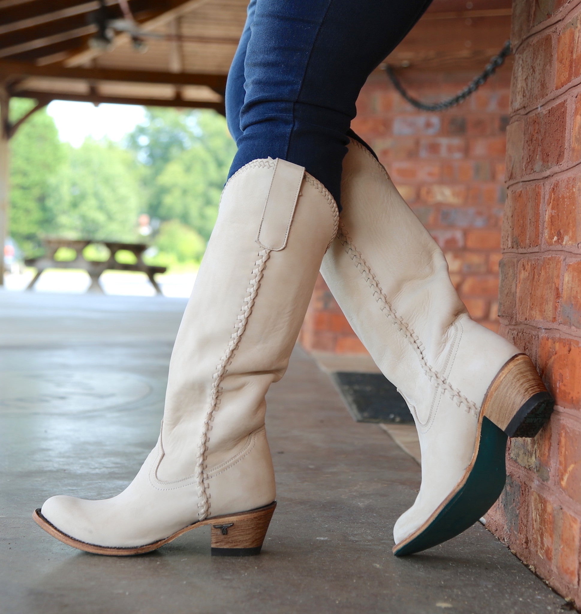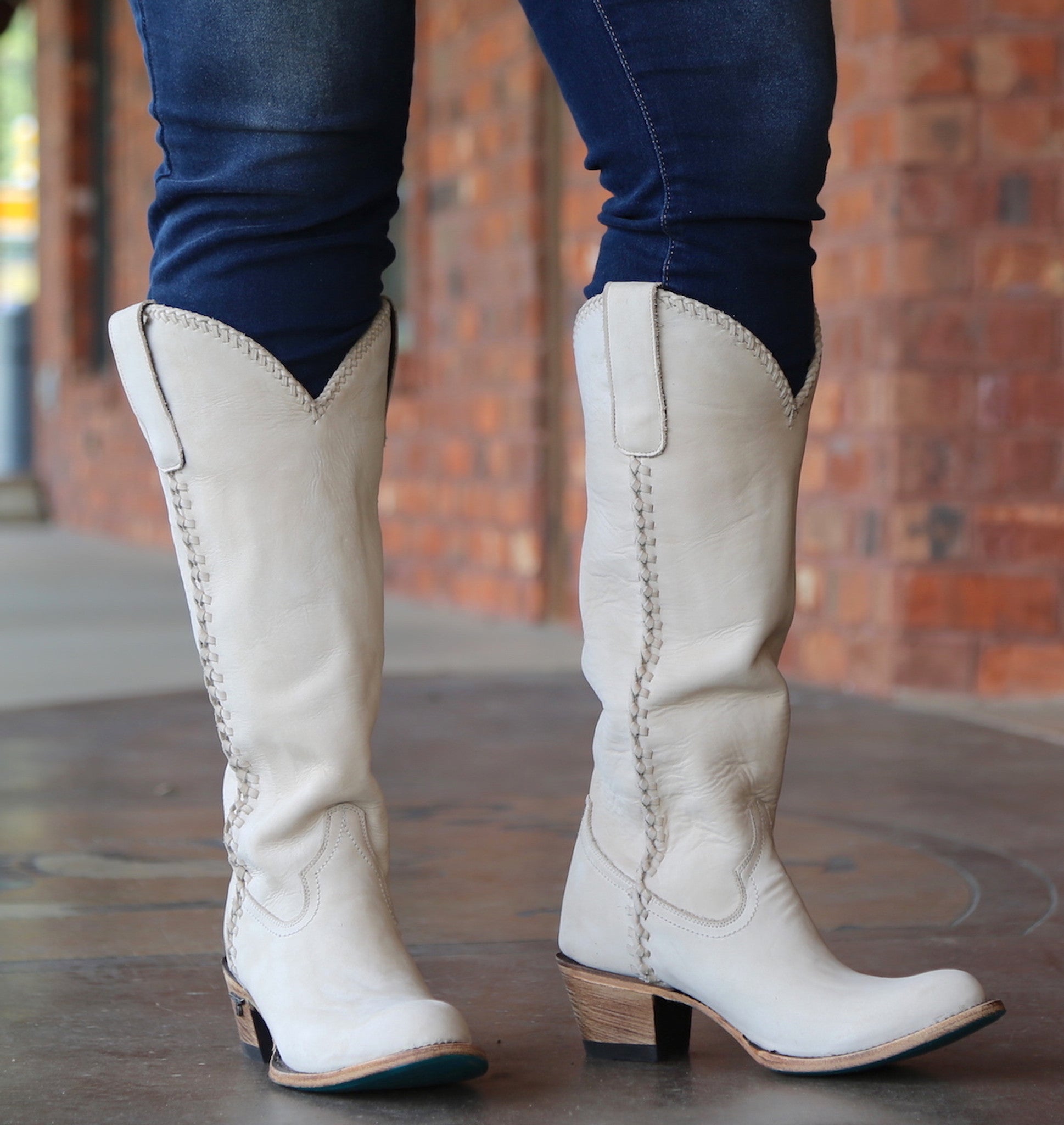 See Jane Walk. In these stunning Lane Boots! They may be called the Plain Jane, but this little number has tons of character. We're loving the distressed buttermilk bone leather, classic cowgirl boot silhouette, and braiding detail. Easily worn year around with Jeans or Dresses! See Jane Rock it!