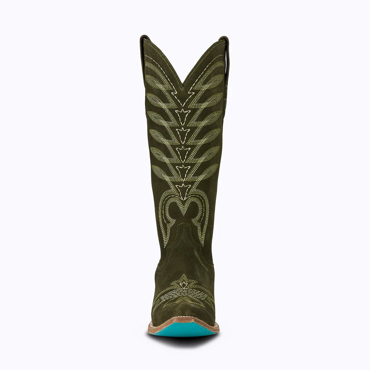 Revel in the elegance of our autumn essential cowboy boot, adorned with a squash blossom motif. Crafted from sumptuous suede leather and highlighted with intricate stitching. This tall statement piece seamlessly melds high fashion with western heritage, showcasing an ageless silhouette in contemporary shades.