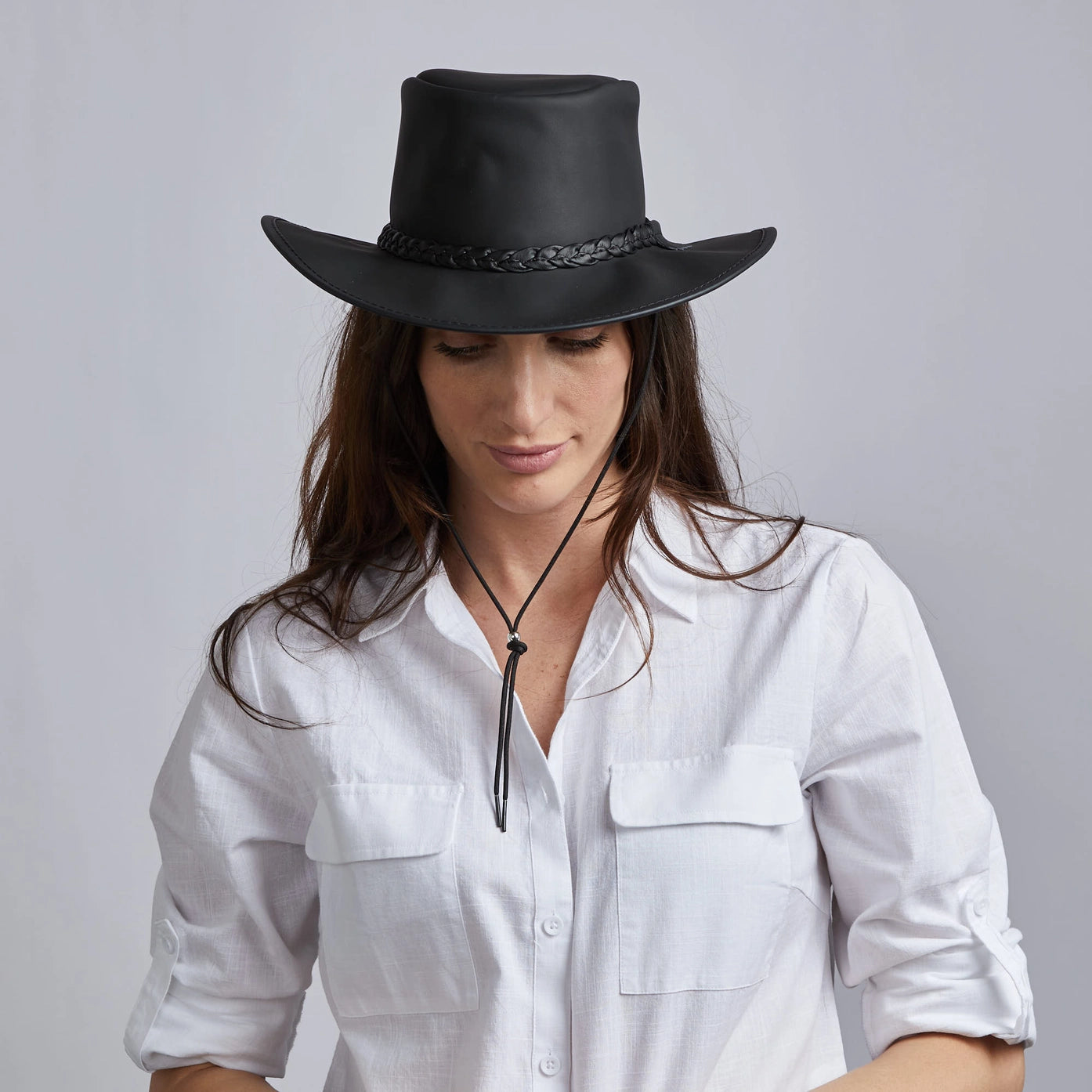 Crushable Leather Outback Hat combines rugged style with convenient packability. Made from lightweight cowhide leather, this medium-brim hat features a braided leather band and chin cord, perfect for men seeking durable sun protection that’s easy to take on the go.