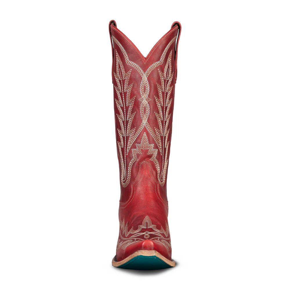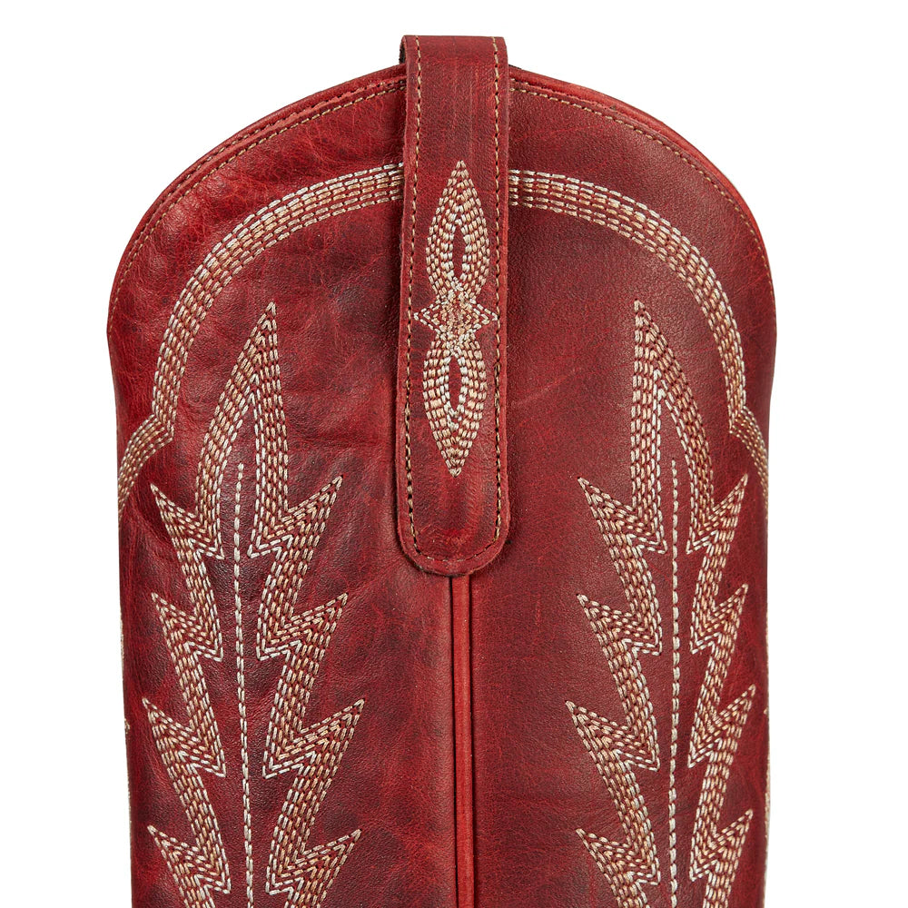 She's the perfect red cowgirl boot. Heirloom quality with a core western influence. The classic snip toe profile is embroidered to perfection with a twist on traditional flame stitch. Smoldering Ruby Red finish makes this a perfect fit for everyday to girl's night out.