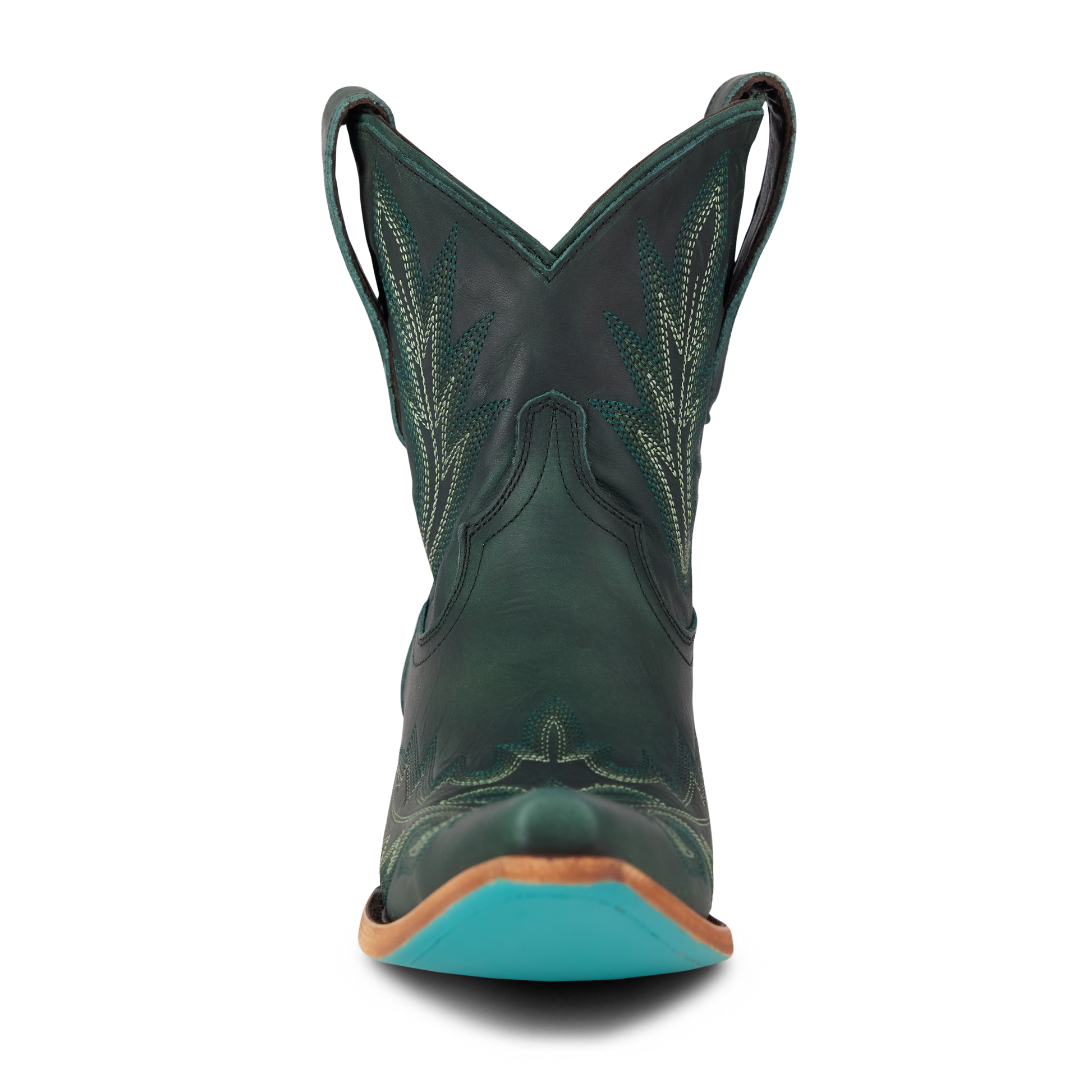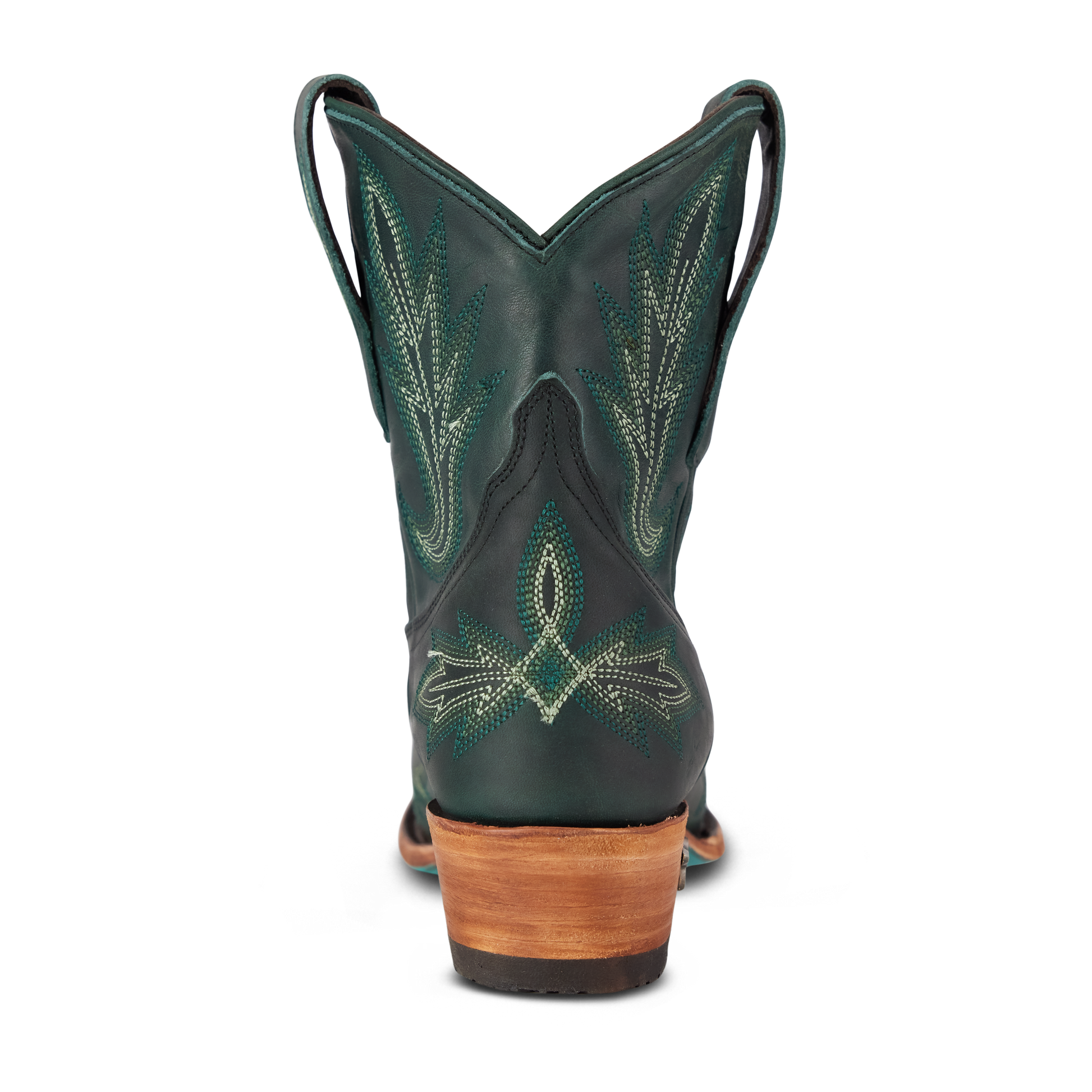 Heirloom quality ankle boots with a western influence. The classic snip toe profile is embroidered to perfection with a twist on traditional flame stitch in bootie form. She's short, sweet, and just the right height to pair well with your wardrobe.