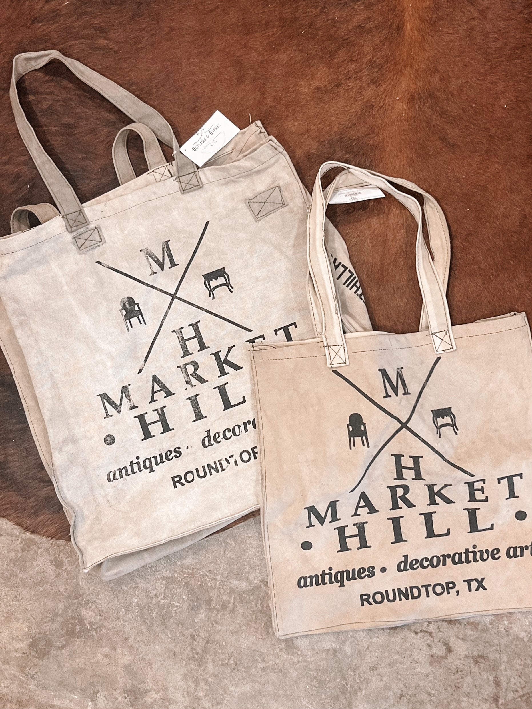 The Market Hill Canvas Tote is perfect for your next adventure! It's made from recycled military tents and is large enough to fit all your travel essentials or beach supplies. Plus, it's easy to haul around with you wherever you go!
