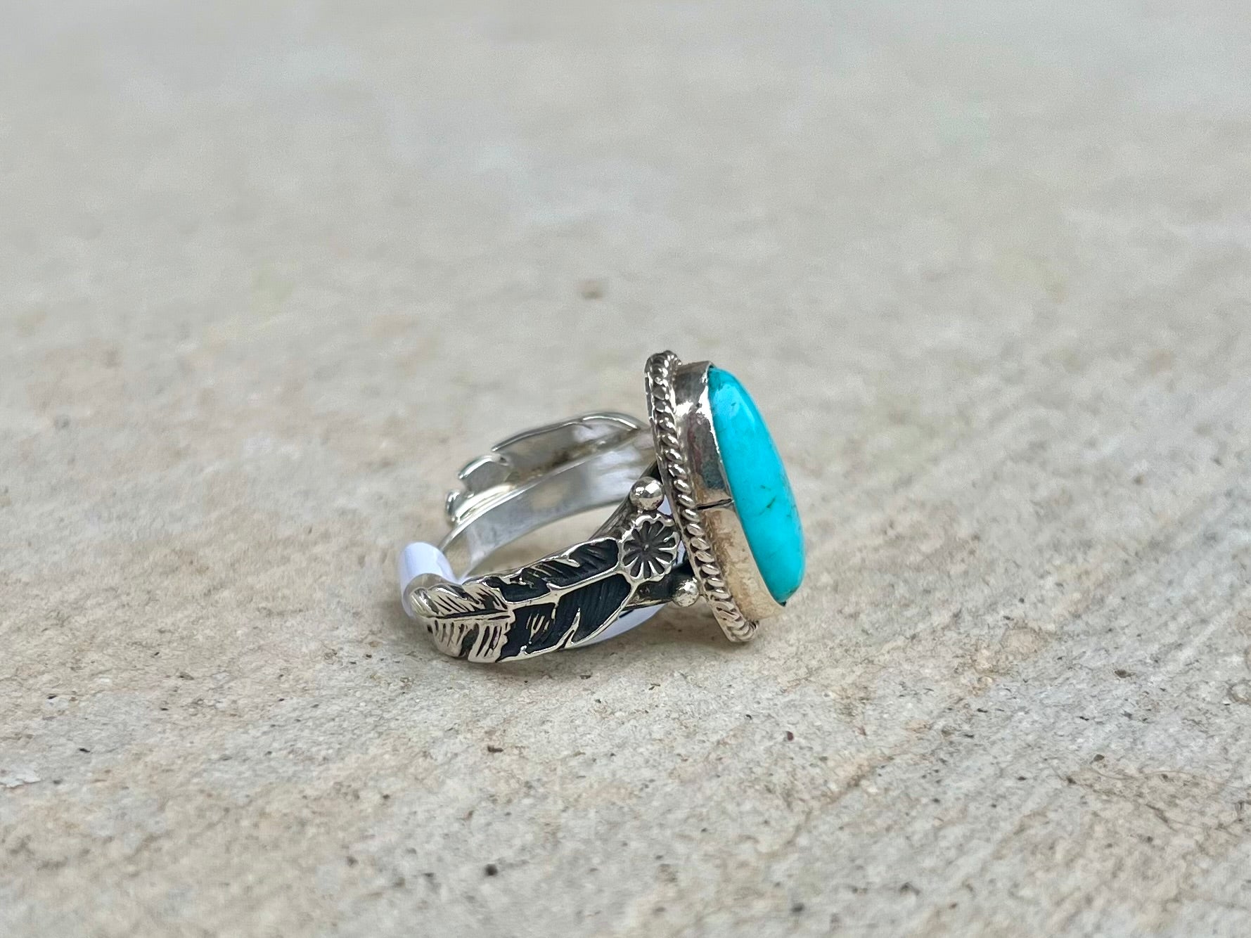 Handcrafted by Navajo artisans, this sterling silver band ring showcases a striking piece of Kingman turquoise set within an elegant leaf-motif design. The natural stone displays the distinctive blue-green hues characteristic of Arizona's renowned Kingman mines. Expertly worked in .925 sterling silver, the ring combines traditional Native American craftsmanship with timeless botanical styling. Pre-sized at 6.5, this authentic piece makes a sophisticated statement for everyday wear or special occasions.