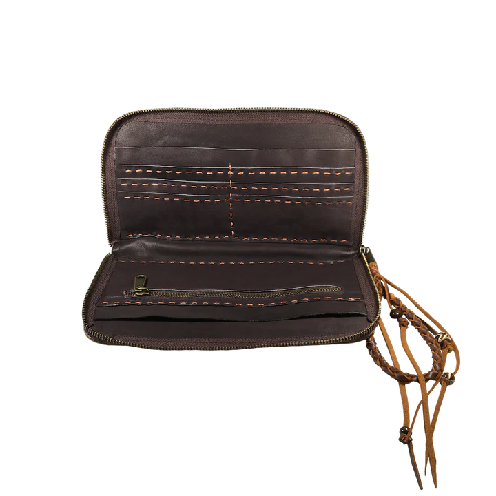 Carson, from the Phoenix Collection, is a large wallet perfectly suited for a larger bag or to carry alone. Leather and our hand-sewn embroidery are crafted together with beautiful decorative stitching.