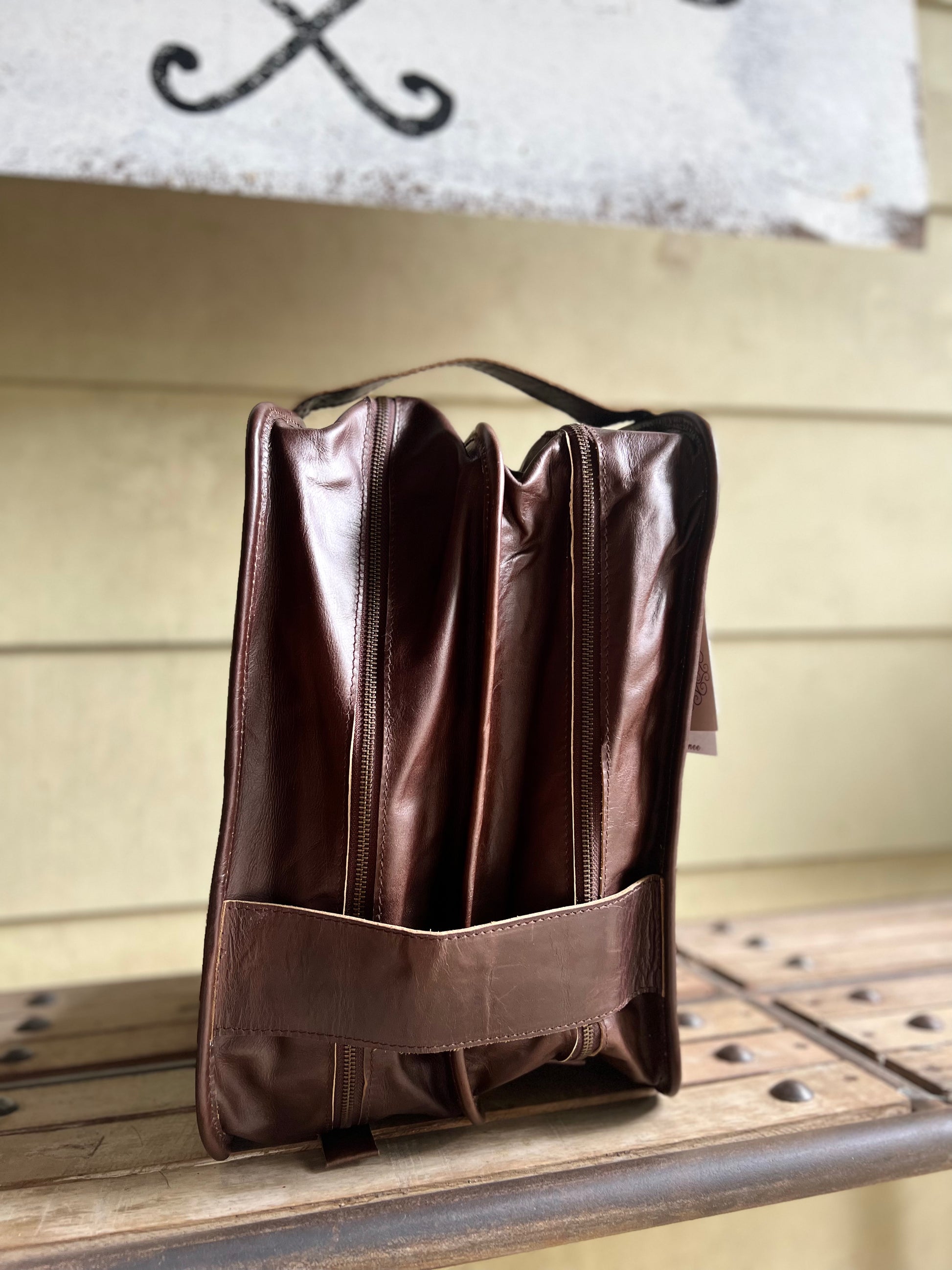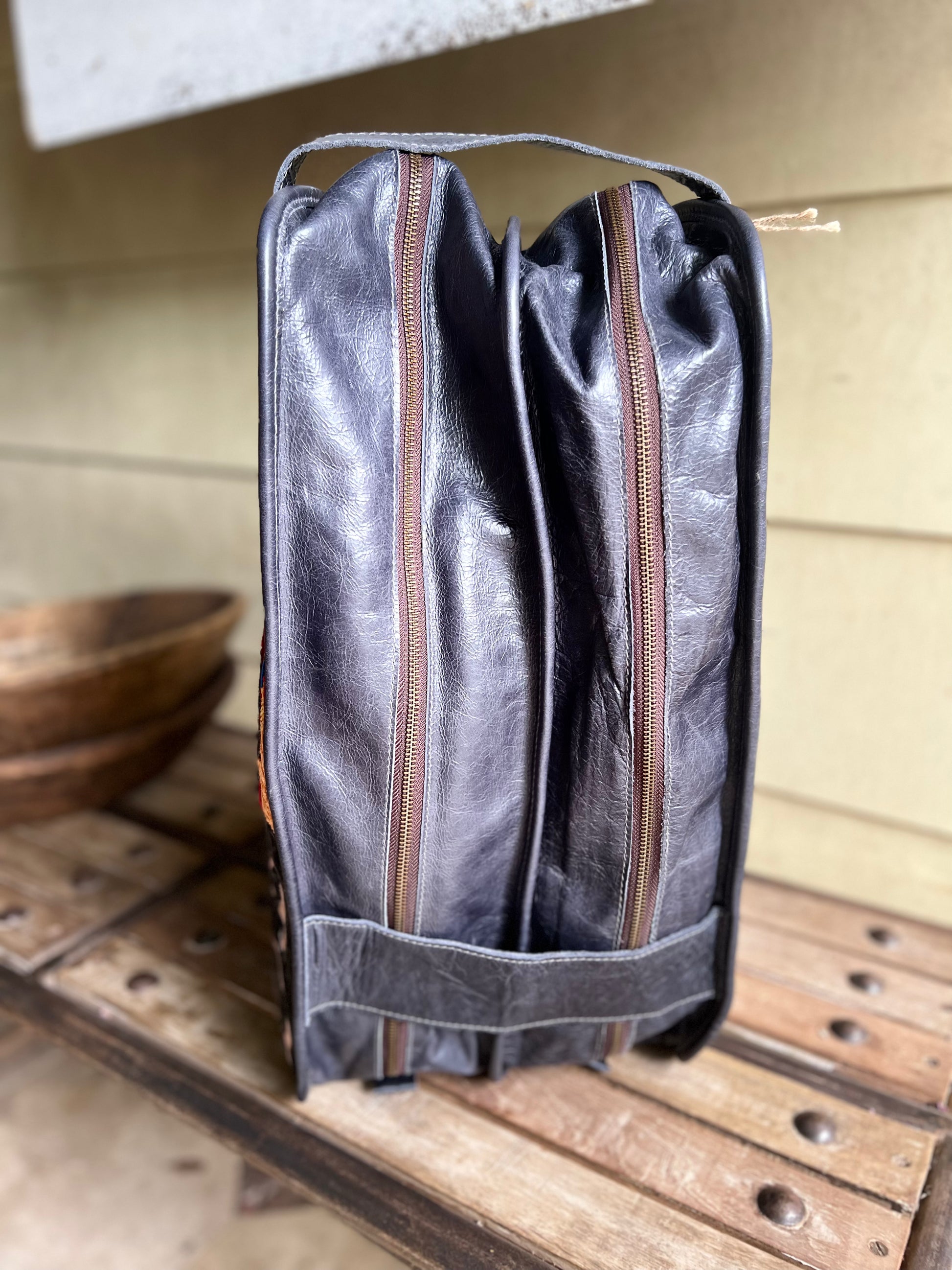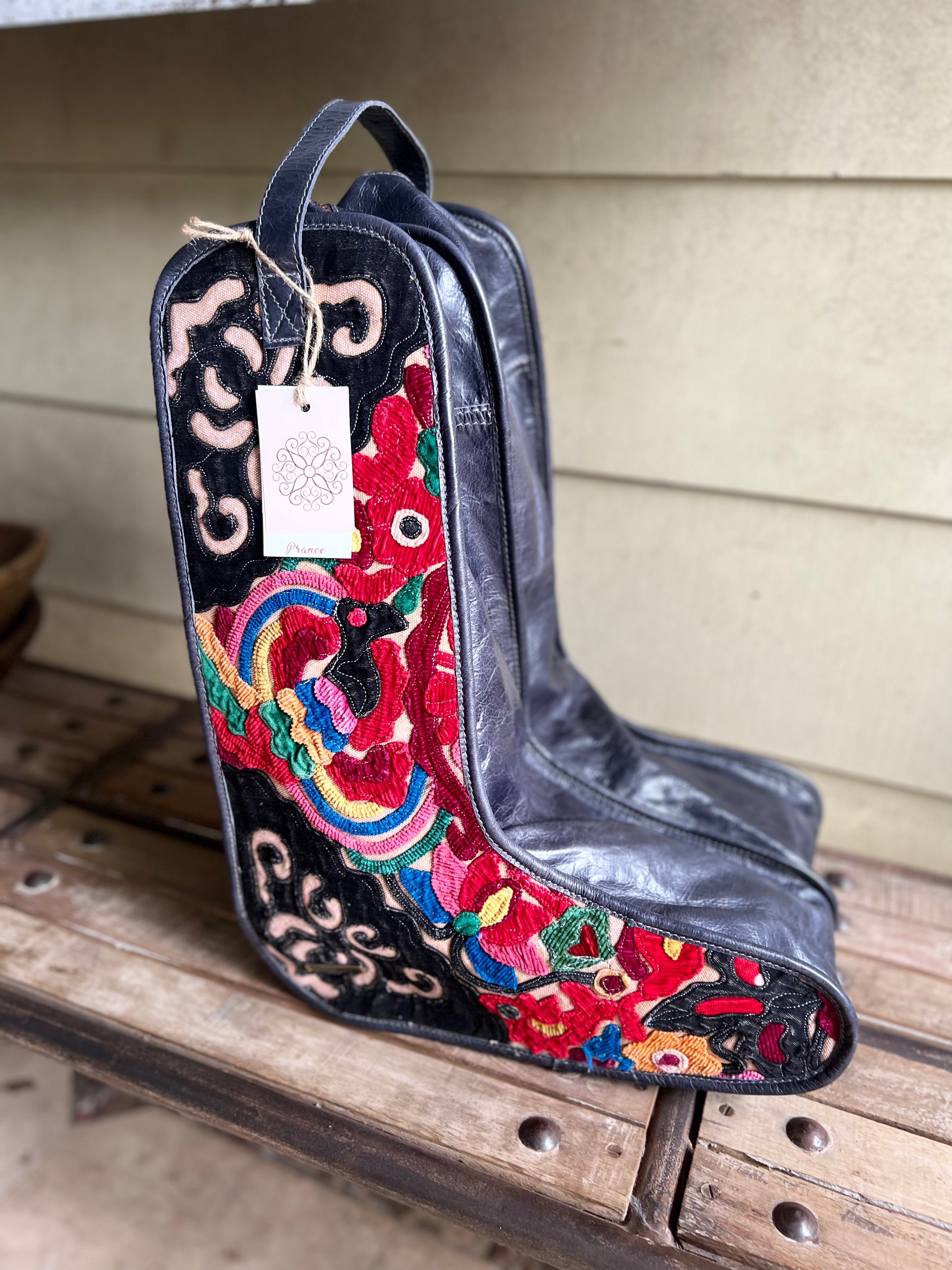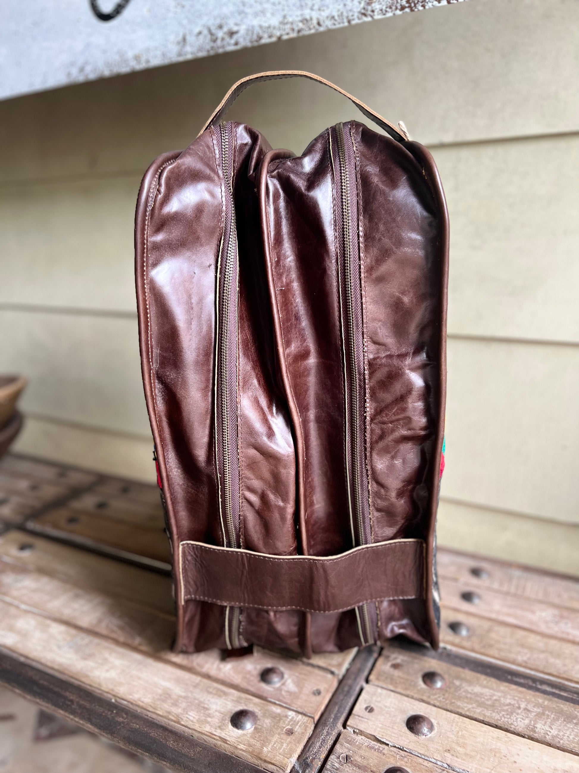This leather Artisan Boot Bag from Pranee offers an easy way to take your boots with you wherever you go. Handcrafted in Thailand, it features a convenient handle and a luggage strap to connect it to your suitcase. Travel in style with Pranee!
