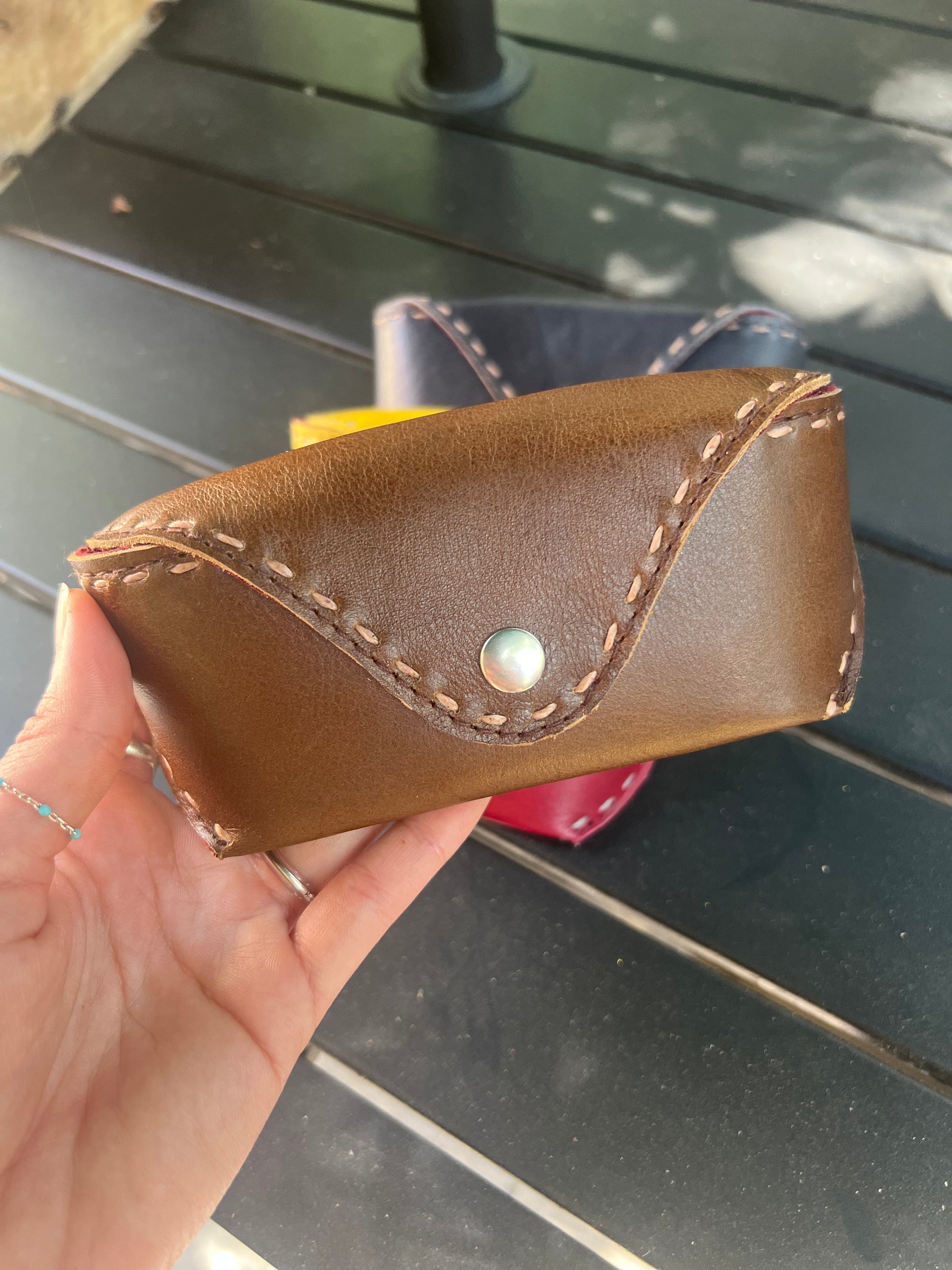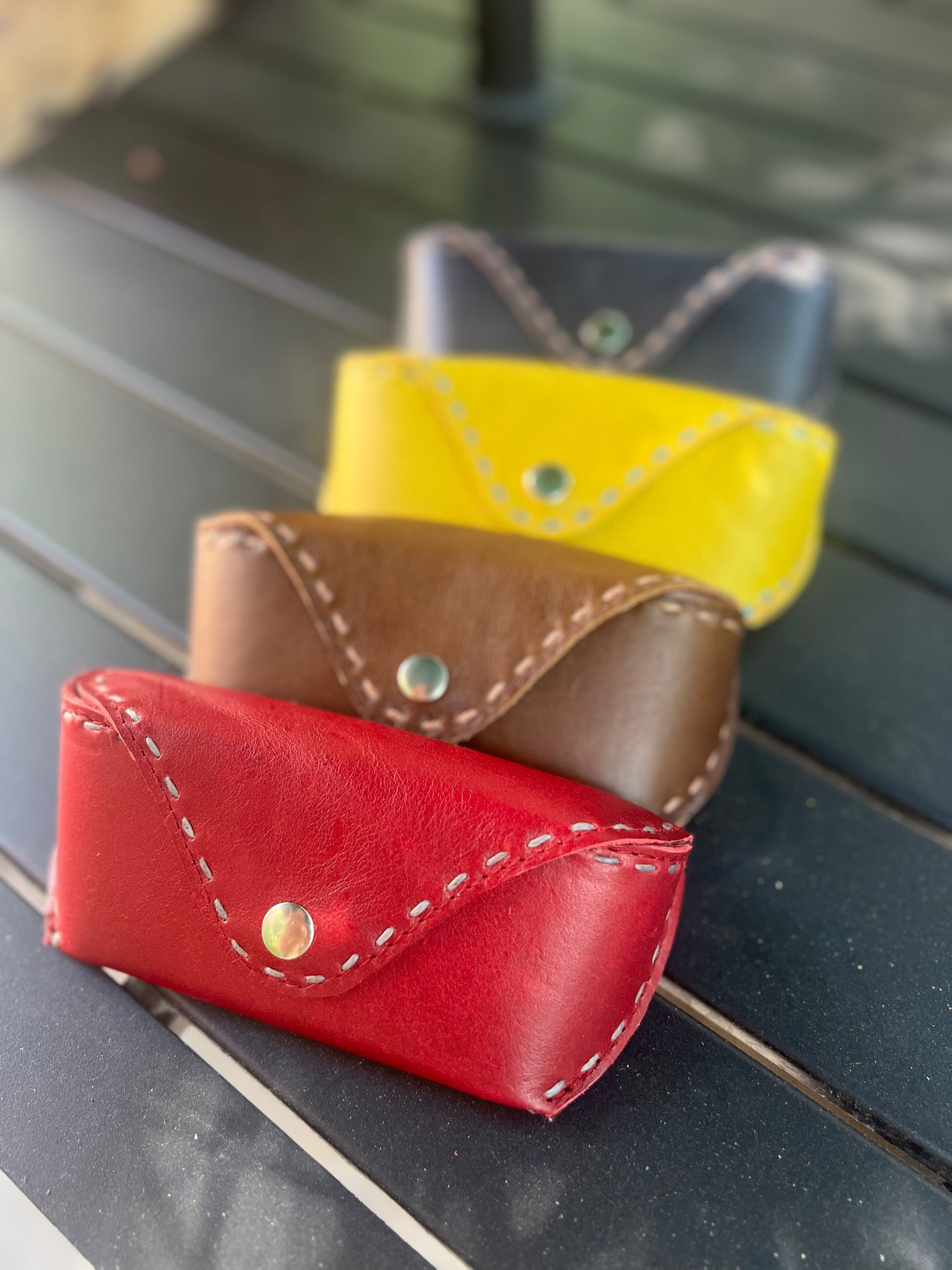 Handmade authentic leather sunglass cases that come in a variety of neutral or bright, fun colors.