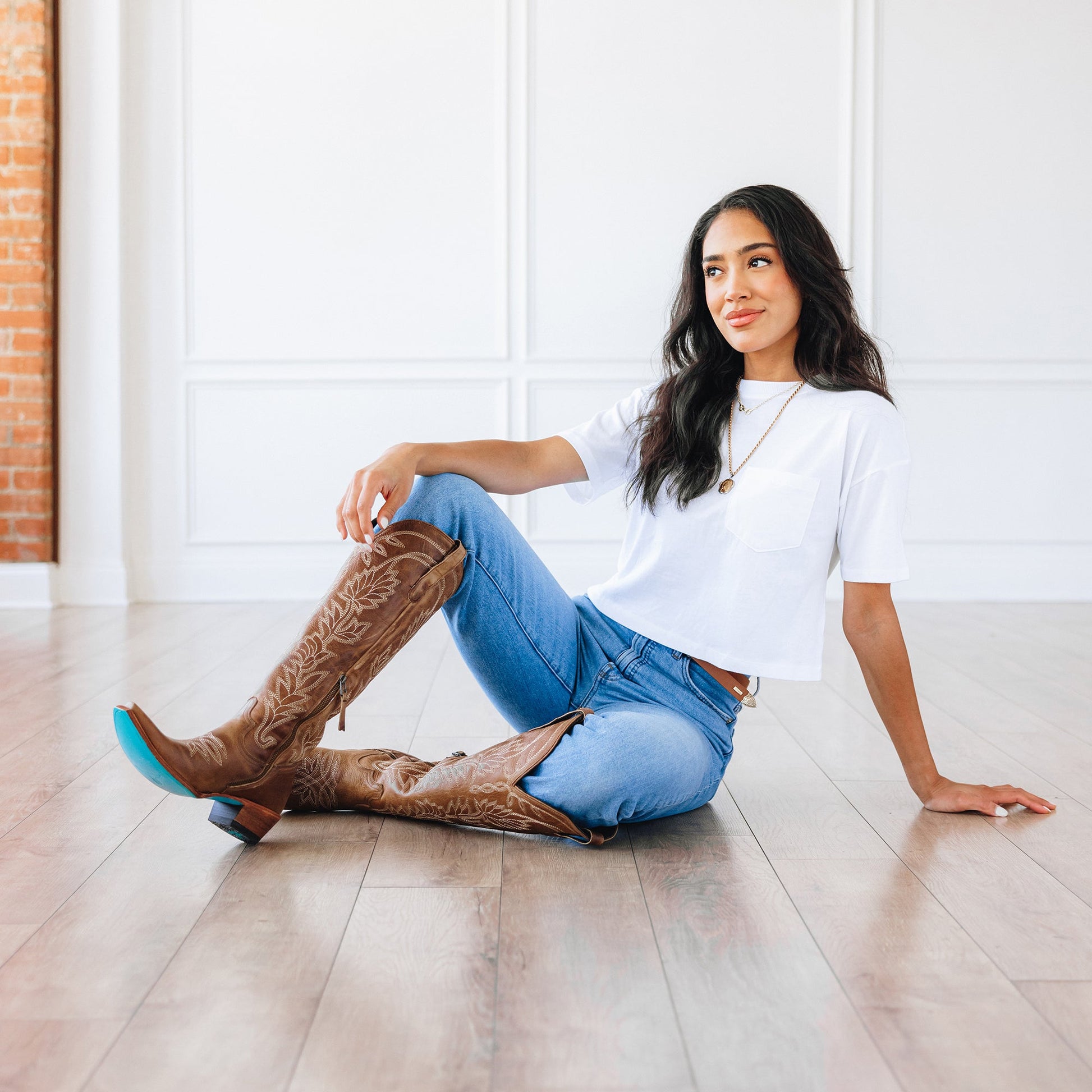 Featuring a convenient side zipper, these knee-high boots are easy to slip on and off, while the pull tabs and slightly distressed finish give them a well-loved, authentic feel. The pointed toe and classic Cuban heel provide a flattering silhouette, and the signature Lane turquoise sole adds a unique pop of color with every step.