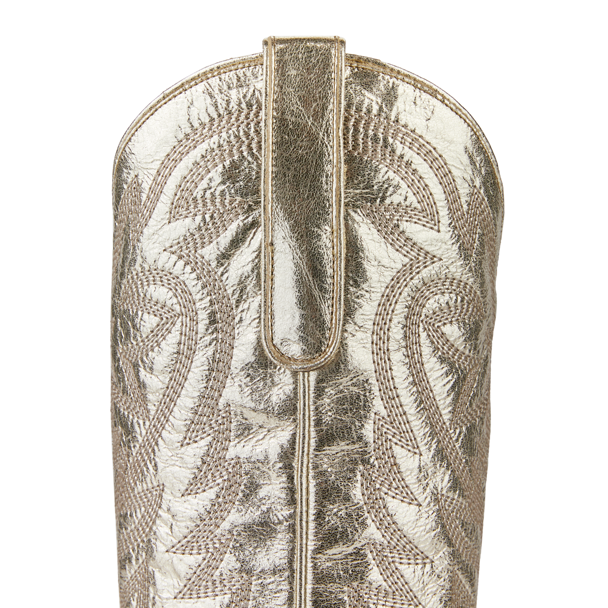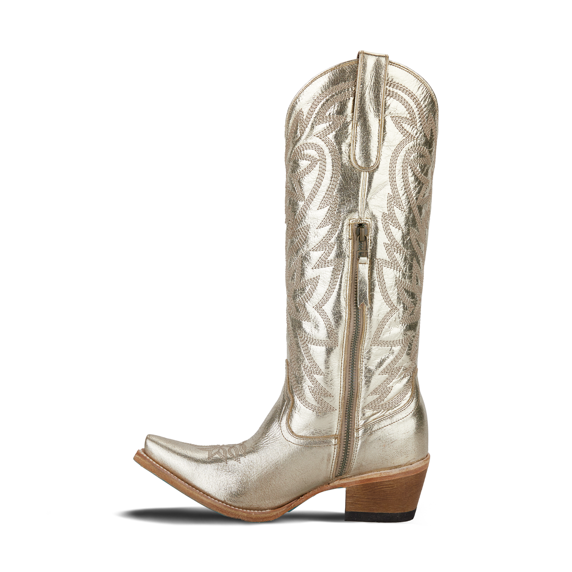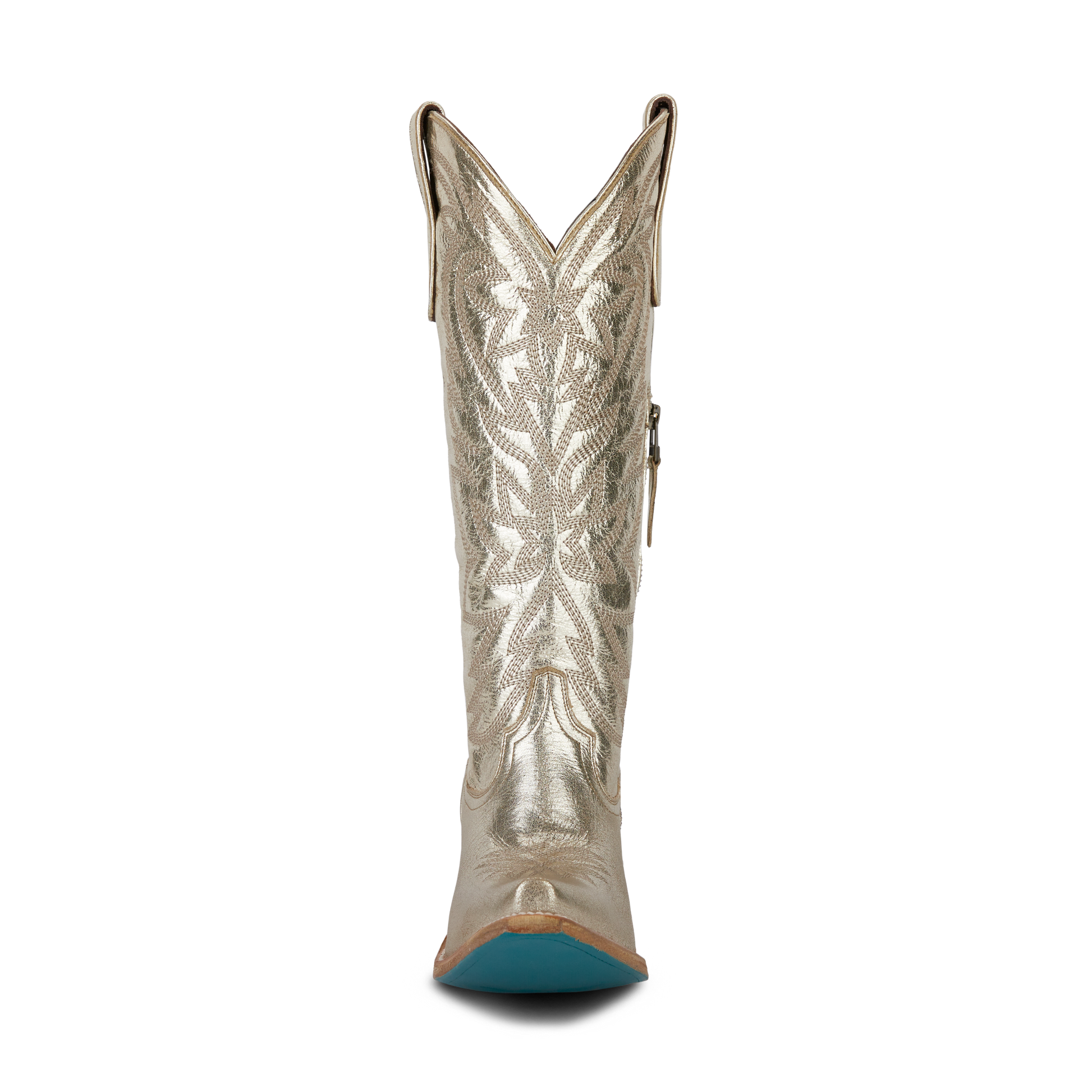 She's the perfect chic, metallic cowgirl boot with a pop of gold right off the runway. This classic snip toe is accompanied by an abstract cosmic starburst pattern and retro-inspired toe stitch. Level up your wardrobe with this blue bottom hottie.