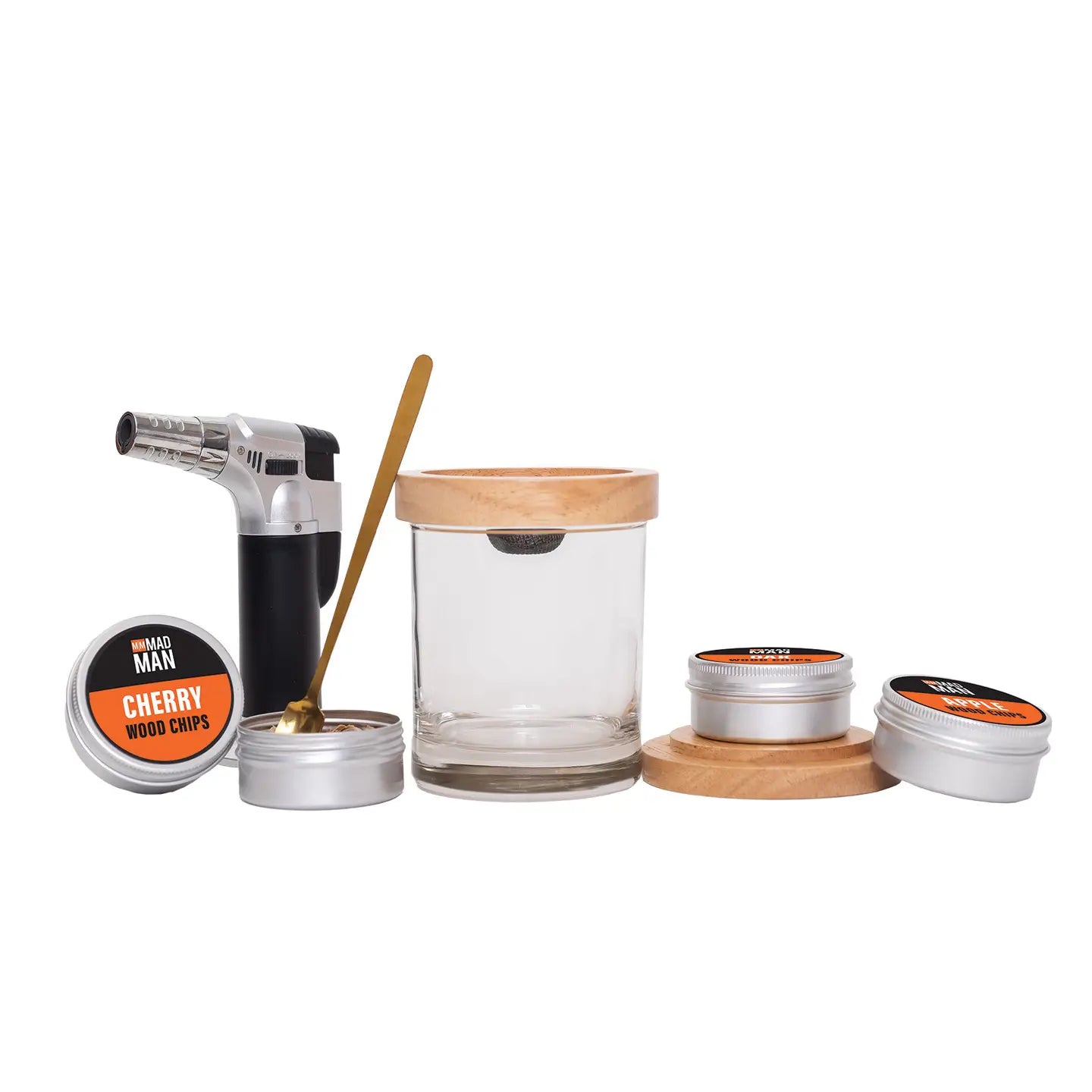 Give your whiskey cocktails a heavy, smoky flavor for that refined taste you crave with Mad Man’s Whiskey Smoker. Our comprehensive kit includes all the essentials to infuse your cocktail of choice with layers of savory flavor, featuring a portable torch, a wood top with a filter for smoke infusing, an assortment of wood chips in various flavors, a scoop, and cleaning tool.